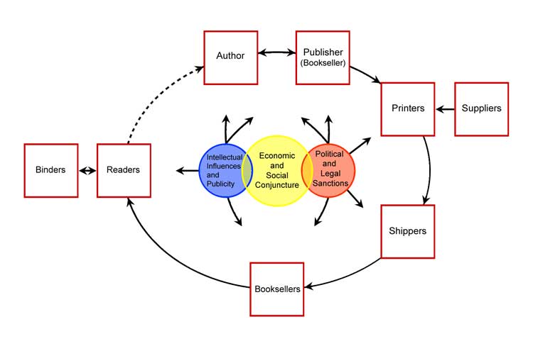 రచయితతో (Author) మొదలై, ప్రచురణకర్తలు (Publishers), ముద్రణ వ్యవస్థ (Printers), పంపిణీదారులు (Distributors), వ్యాపారుల (Sellers) ద్వారా పాఠకుడిని (Reader), పాఠకుడిని/ పాఠకసమాజాలని తిరిగి రచయితతోనూ కలిపే మొత్తం ప్రక్రియనంతా — సమగ్రంగా గానీ, సూక్ష్మంగా దేనికది లోతుగా గానీ — ప్రభావితం చేసే రాజకీయ, ఆర్థిక, సాంస్కృతిక వ్యవస్థలని, వాటి దేశ-కాల పరిస్థితులతో మేళవిస్తూ పరిశోధించే విధివిధానాన్ని, సమాచార వలయం (Communication Circuit) అని నిర్వచించాడు డార్న్టన్. ఈ సమాచార వలయం రచయిత మదిలో మెదిలిన ఒక ఆలోచన సందేశంగా అక్షరరూపం దాల్చి, ఆ అక్షరాలు సమాచారంగా అచ్చులో ముద్రించబడి పాఠకుడిని చేరి తిరిగి ఆలోచనగా మారే పూర్తి చట్రం.