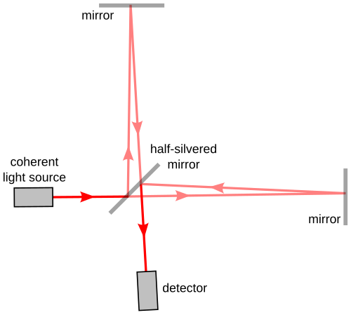 ఒక కాంతి కిరణాన్ని 45 డిగ్రీల కోణంలో ఉన్న ‘సగం వెండి పూత పూసిన’ (అంటే పాక్షిక పారదర్శకత కలిగిన) అద్దంపై పడేలా చేస్తాడు. దీనివల్ల ఆ కిరణంలో ఒక సగం దూసుకుపోగా, మరో సగం ప్రతిబింబిస్తుంది. ఈ రెండు సగభాగాలు ఇద్దరు ఈతగాళ్ల వంటివి. ఈ రెండూ కూడా దూరంగా అమర్చిన అద్దాలను తాకి, తిరిగి మళ్ళీ అదే పాక్షిక పారదర్శక అద్దం వద్దకు చేరుతాయి. ఇక్కడ అవి మళ్ళీ సగం ప్రతిబింబించి, సగం అవతలికి వెళ్తాయి. ఆ అద్దం వెనుక ఒక టెలిస్కోప్ను ఉంచుతారు, తద్వారా రెండు సగభాగాలలోని కొంత భాగం ఈ టెలిస్కోప్లోకి చేరుతుంది. ఇక్కడ ఆ రెండు కాంతి తరంగాలు ఒకదానితో ఒకటి కలిసి, టెలిస్కోప్లో వెలుగు-చీకటి చారల రూపంలో ఒక పటాన్ని (Interference Fringes) ఏర్పరుస్తాయి.
