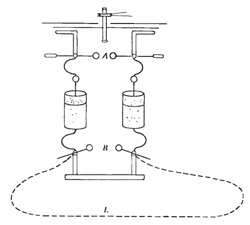 “A” తో గుర్తించబడిన గుబ్బలను (Knobs) ఒకవైపు ఘర్షణ ద్వారా విద్యుత్తును ఉత్పత్తి చేసే పరికరానికి (Voss machine), మరోవైపు లేడెన్ జాడీల లోపలి ఉపరితలానికి కలిపి, ఆ జాడీల వెలుపలి ఉపరితలాలను సర్దుబాటు చేయడానికి వీలున్న స్పార్క్ గ్యాప్ “B” కి కలిపాడు. ఈ స్పార్క్ గ్యాప్ (B) యొక్క రెండు చివరలను అతి తక్కువ నిరోధకత కలిగిన ఒక పొడవైన లోహపు తీగెతో (L) కలిపాడు.