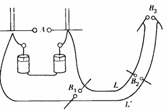 పలు స్పార్క్ గ్యాప్ ల (B1, B2, B3) అమరిక, పొడవైన తీగెలు (L, L’)
