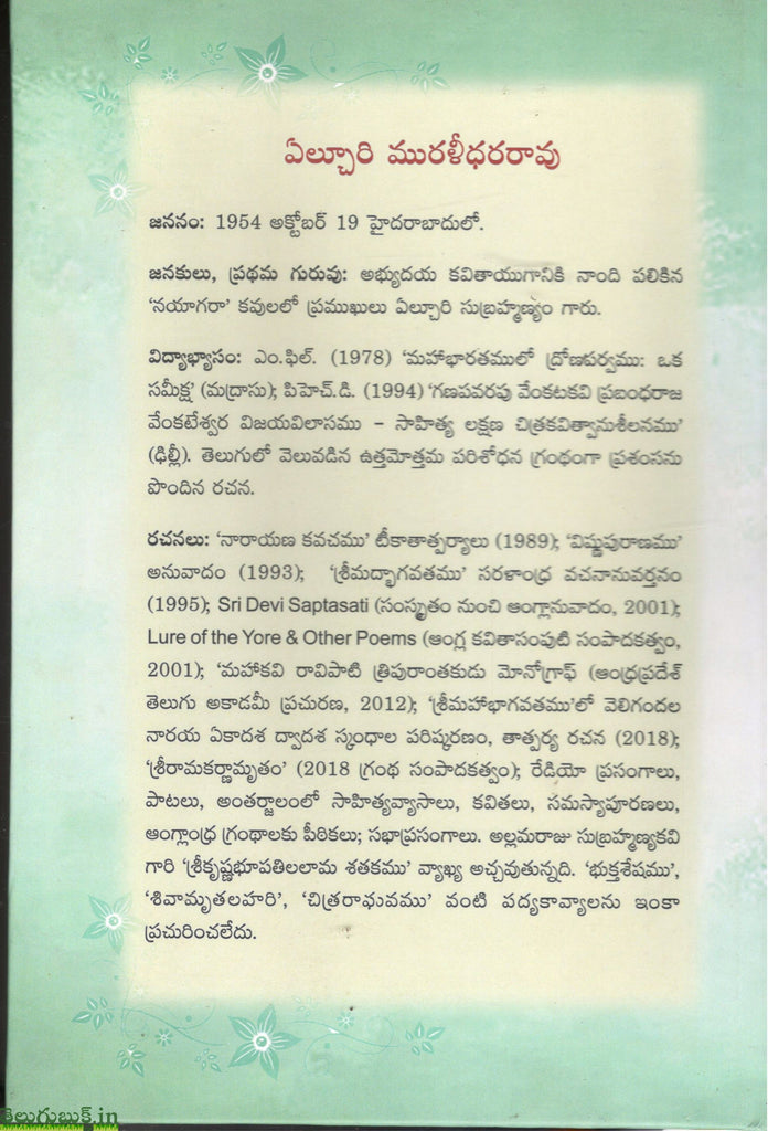 ఇవికాక ఆచార్య శ్రీ ఏల్చూరి మురళీధరరావుగారి రచనలు ఇంకా చాలా ఉన్నాయి. అవన్నీ కూడా ముద్రణకు నోచుకొని, తెలుగు సాహిత్యప్రపంచానికి కొత్త ఊపిరులూదాలని మనసారా ఆకాంక్షిస్తున్నాను. వారికి అనేక మనఃపూర్వక నమఃపూర్వక శుభాభినందనలను విన్నవిస్తున్నాను. ఈ వ్యాససంపుటిని సర్వాంగసుందరంగా ముద్రించి, ఆంధ్రులకు మహోపకారం చేసిన అజో-విభొ కందాళం ఫౌండేషన్ వ్యవస్థాపకులు#శ్రీ అప్పాజోస్యుల సత్యనారాయణగారికి ప్రత్యేకధన్యవాదపూర్వక నమస్కారాలు.