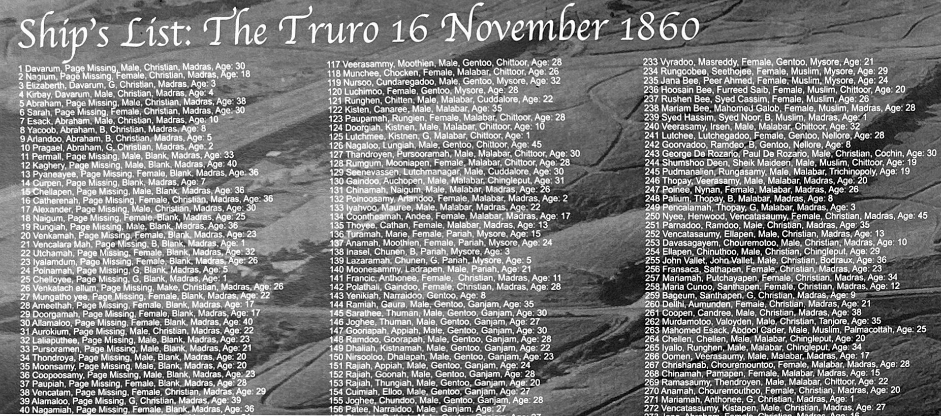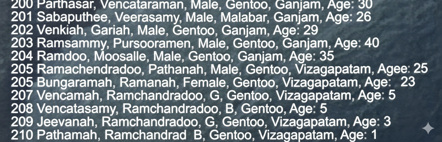 ఈ కూలీలని తీసుకు రావడంలోనూ, తీసుకొచ్చిన తర్వాతా బ్రిటిష్వాళ్ళు ప్రదర్శించిన అమానుషత్వం పక్కన పెడితే, వారి పేర్లని టోకున “నామ రూపాల్లేకుండా” చేయడం, పుండుమీద కారం జల్లడమే! పాపం ఈ ఇండెంచర్కి సిద్ధపడి వచ్చిన వాళ్ళందరూ చక్కగా వాళ్ళ పేర్లని ఓ కాగితమ్ముక్కమీద రాసో రాయించుకునో తీసుకొస్తే, బ్రిటిష్ గుమస్తాలు వాటిని చెత్తబుట్టలో పారేసి, ప్రతి ఒక్కరితోనూ తమ పేరు చెప్పించి, దాన్ని వారికి తోచినట్టు ఇంగ్లీషులో వ్రాసేవారట. తర్వాత జరిగిన మార్పులు చేర్పులతో కలిసి, ప్రవాసుల పేర్లు మనం గుర్తు పట్టలేని రకంగా ఉంటాయి. ఉదాహరణకి Moodley అనే పేరుని ముదలియర్ గా గుర్తుపట్టడానికి చాలా క్రియేటివిటీ కావాలి! అలానే, విశాఖపట్టణం అనే పేరు వైజాగ్గా ఎలా రూపాంతరం చెందిందో కూడా ఈ పాసెంజర్ లిస్టులో మనకి తెలుస్తుంది. అలానే హిందువుల్ని Gentoo అనే మాటతో వ్యవహరించేవారని అర్థమవ్వడానికి గూగుల్ అవసరమైంది.