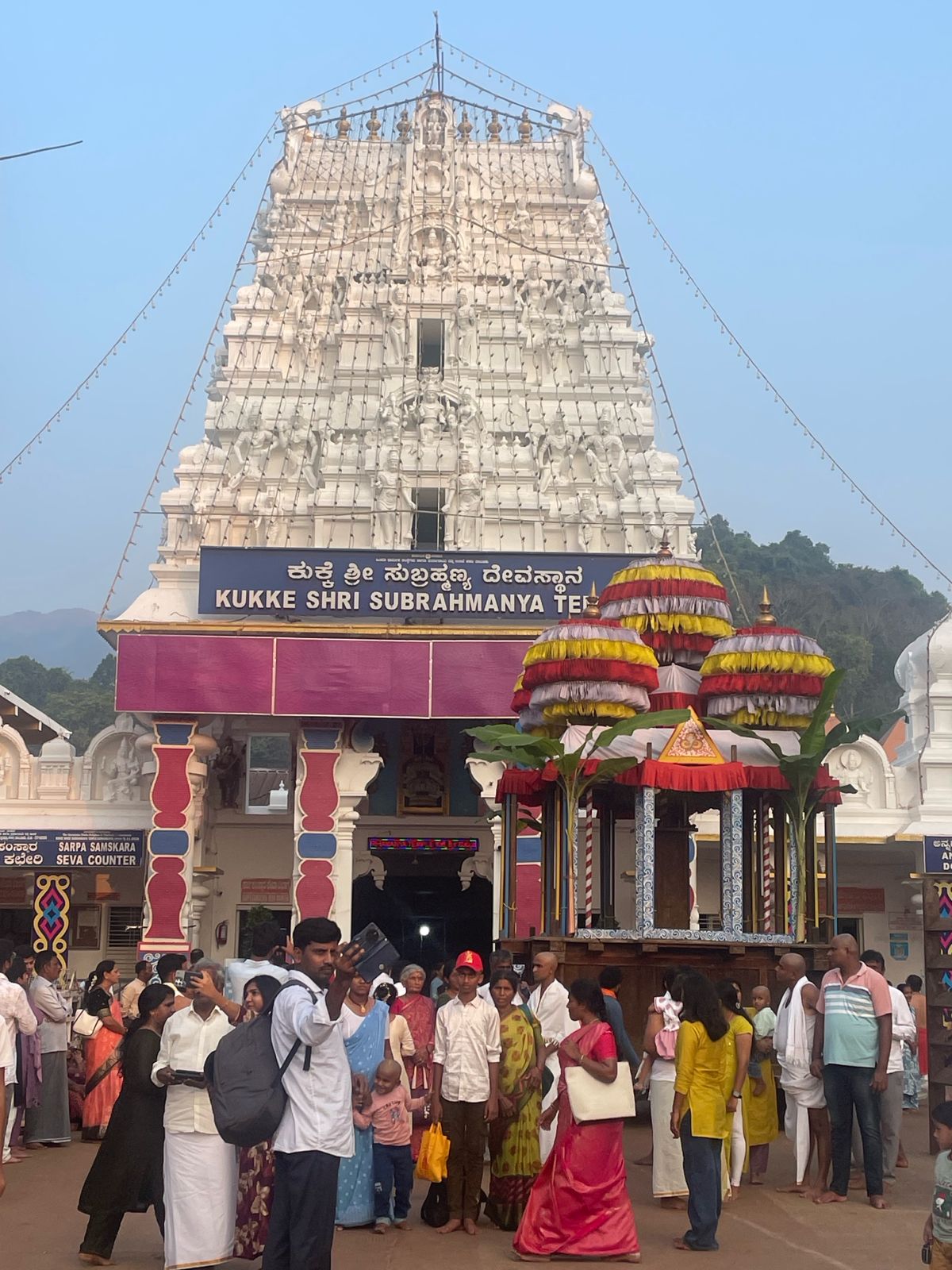 విశాలమైన ప్రాంగణం ఉంది ఈ కుక్కె సుబ్రమణ్యస్వామి ఆలయానికి. కారును పార్క్ చేసిన చోటినుంచి దాదాపు అరఫర్లాంగు మేర విస్తరించింది. గుడి గుమ్మంవరకూ ఆ ప్రాంగణం నిండా తినుబండారాలు, పూజాసామగ్రి అమ్మే దుకాణాలు సరేసరి.