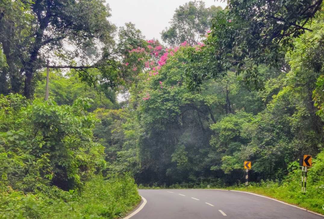 దట్టమైన పచ్చని అడవి మధ్యనుంచి సాగిందా నల్లటి, నున్నటి తారు రోడ్డు. రోడ్డు అంచులను చూచిస్తూ రెండువైపులా తెల్లని పట్టీలు. అప్పుడొకటీ అప్పుడొకటీ ఎదురవుతున్న వాహనాలు.