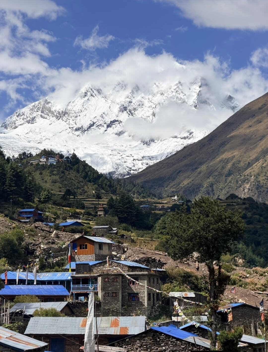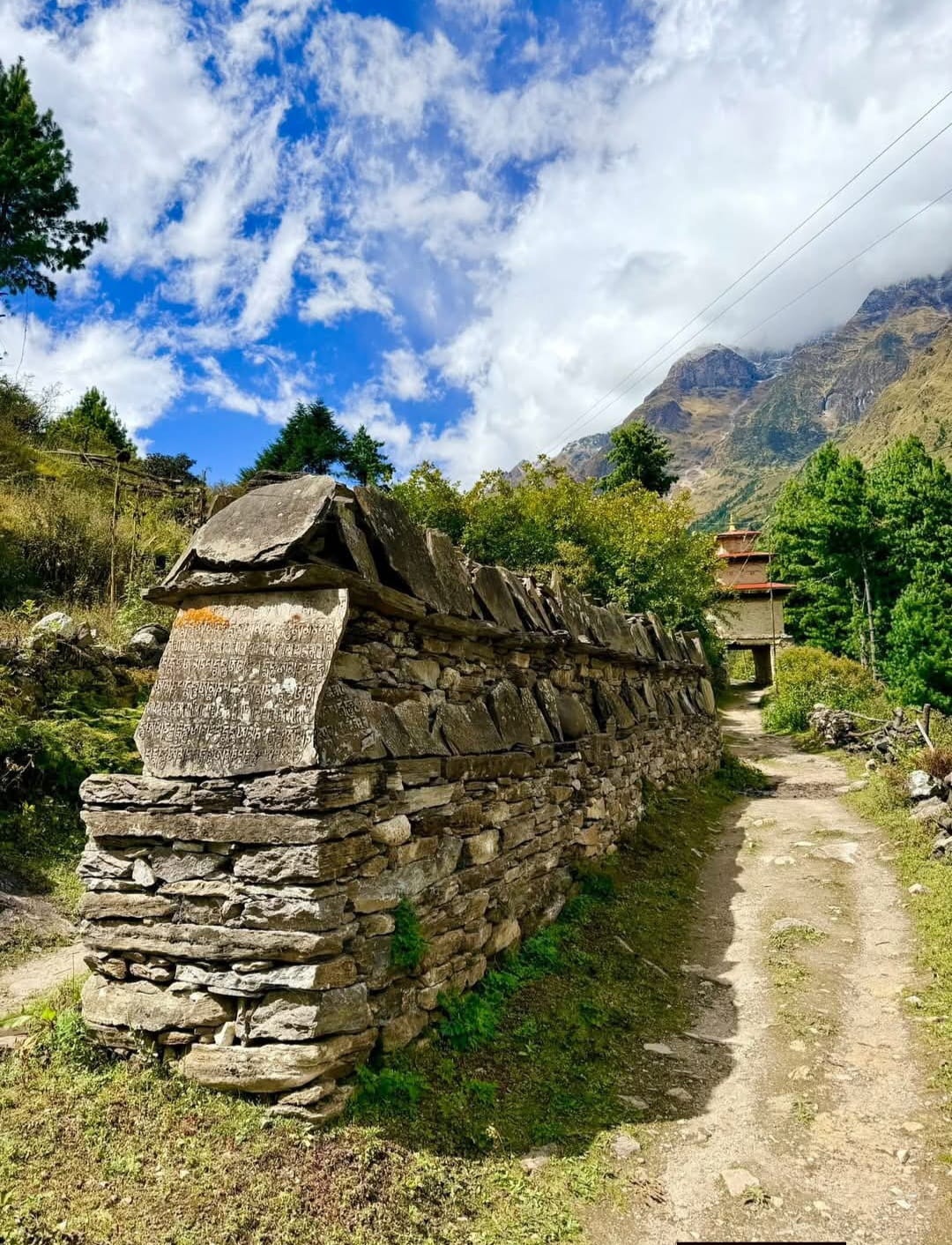 ఊరి మొగలో మూడు అంతస్తుల ‘కణి’ కనిపించింది. గంభీరమైన ఆకృతి. రెండవ అంతస్తు గోడమీద బుద్ధుని నేత్రాలు, తోరణాలుగా కట్టిన ప్రార్థనా పతాకాలు – మమ్మల్ని బాగా ఆకట్టుకుందా కట్టడం. అది దాటాక మా బాట పొడవాటి మణికుడ్యం పక్కగా సాగింది. ఆ కుడ్యపు శిలల మీద అక్కడక్కడ వివిధ యోగముద్రలలో ఉన్న బుద్ధుని ఆకృతులు చిత్రించి ఉన్నాయి. కొన్ని రాళ్ళమీద టిబెటన్ లిపిలో అక్షరాలు ఉన్నాయి. దారిలో కనిపించిన ఓ స్థానిక యువకుడిని ‘ఏమిటా అక్షరాల ప్రాముఖ్యత? అని అడిగాను. ‘ఓం, మణి పద్మే ఓం’ అంటూ వాటిని చదివి అది హిమాలయ ప్రాంతాలన్నిటా వినవచ్చే ప్రముఖ బౌద్ధమంత్రం అని వివరించాడా యువకుడు. ఆ మంత్రం నాకు బాగా పరిచయమే అనిపించింది. ‘మీరెక్కడ నుంచి వస్తున్నారూ?’ అని హిందీలో అడిగాడు. క్లుప్తంగా వివరించాం. అతను ల్హో గ్రామానికి చెందిన, ఖాట్మండూ యూనివర్సిటీలో చదువుకుంటున్న మనిషట. దసరా శెలవలు కుటుంబంతో గడపడానికి వచ్చాడట. ‘మీకు వీలయితే మా ఊళ్ళో ఉన్న రిబంగ్ మానెస్ట్రీలో ఈ రాత్రి గడపండి. టిబెటన్ బుద్ధిజం గురించి మంచి అవగాహన కలుగుతుంది’ అన్నాడు. రాత్రి అక్కడ ఆగే ఆలోచన మాకు లేదు. పోనీ వెళ్ళి కాసేపు గడుపుదామా అంటే ఆ మధ్యాహ్నం వేళ మానెస్ట్రీ మూసేసి ఉంది. ఊళ్ళోని బౌద్ధ స్వాగతద్వారం, ప్రార్థనా పతాకాలు, ఛోర్టన్లు, మణికుడ్యం, ప్రార్థనా స్థూపాలు – ఇవన్నీ కలసి ల్హో గ్రామానికి చక్కని సాంస్కృతిక ఆధ్యాత్మిక గాంభీర్యాన్ని సంతరించి పెట్టాయనిపించింది. నాకేమో భారత ఉపఖండంలో కనిపించే బౌద్ధ సంస్కృతి అంటే అమితమైన అనురక్తి. స్థానికులు ప్రశాంతంగా స్తిమితంగా తమతమ దైనందిన కార్యకలాపాల్లో నిమగ్నులై ఉండే కాలాతీతమైన బౌద్ధ గ్రామాలలో నింపాదిగా తిరుగాడటమంటే నాకు ఎప్పుడూ ఇష్టమే. అలా తిరిగే అవకాశం వస్తే అది అంతరాంతరాలను స్పృశించే అనుభవం అయి తీరుతుంది. ఆనాడు ల్హో గ్రామంలో నాకు అలాంటి అనుభవమే కలిగింది.3180 మీటర్ల ఎత్తున, ఒక సన్నపాటి లోయ అంచున నిలచి ఉన్న ల్హో గ్రామం చదరపు పై కప్పులు కలిగిన రాతి ఇళ్ళతో కూడిన అందమైన పురాతన ప్రదేశం. ఆ రోజు వాతావరణం చక్కని సూర్యరశ్మితో వెలిగిపోతూ ఉంది. సుదూర ప్రాంతాలు కూడా స్పష్టంగా కనిపిస్తున్నాయి. మా ప్రయాణంలో మొట్టమొదటిసారిగా దూరాన ఉన్న మనస్లు శిఖరం చూసాం. ఆ శంఖువు ఆకారపు హిమశిఖర రాజస దృశ్యం మమ్మల్ని ముగ్ధులని చేసింది. కానీ మరికాసేపట్లో మబ్బులు కమ్ముకు వచ్చి శిఖరాన్ని మాకు దూరం చేసాయి. కొద్ది క్షణాల పాటైనా ఆ సుందర గంభీర శిఖరాన్ని చూడగలిగినందుకు అంతా ఎంతో సంతోషించాం.