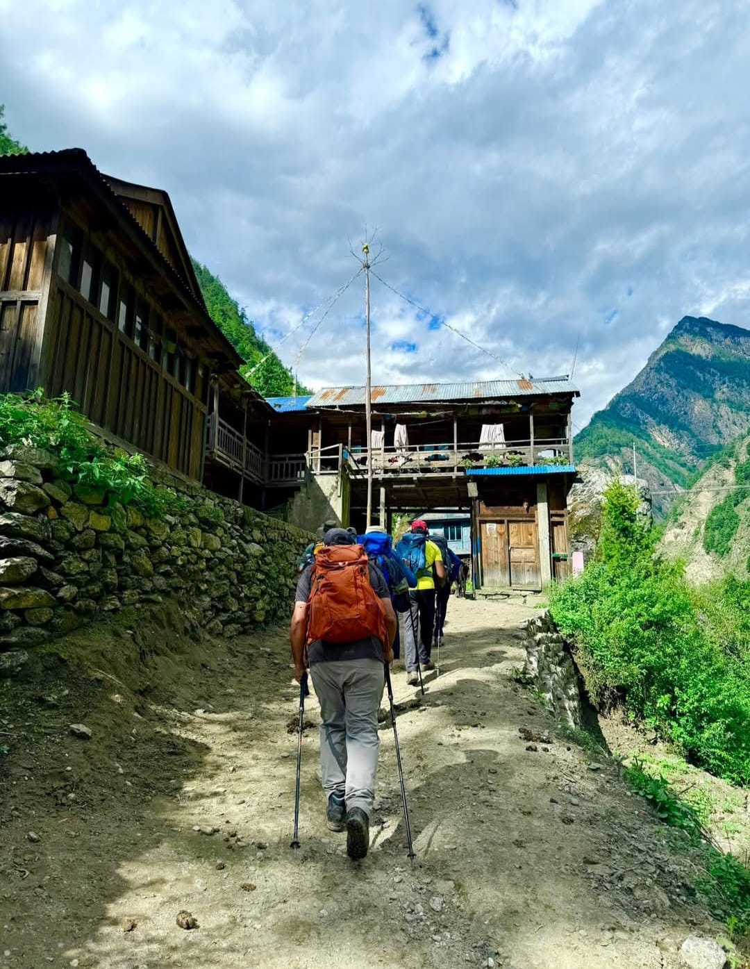 ఆరవ రోజు ఘాప్ నుంచి మా ట్రెక్లోని రెండవ ఘట్టం మొదలయింది. ఈ రెండవ భాగంలో మేము మధ్య హిమాలయాల్లో సంచరిస్తామన్నమాట. మెల్లమెల్లగా ఎత్తులు పెరుగుతూ వెళతాయి. అయినా మొదటి విడత దిగువ హిమాలయాల్లో మేము నడిచిన దారులతో పోలిస్తే ఈ భాగం స్థూలంగా సులువైనది అని విన్నాం. ఐదు రోజులుగా గడించిన అనుభవం, ఆత్మవిశ్వాసం ఎలానూ మాకు తోడుగా ఉంటాయి.గంటసేపు నడిచాక ఓ చిరుగ్రామం తటస్థపడింది. గ్రామపు మొగలో పొడవాటి మణికుడ్యం… ఊళ్ళోని ఇళ్ళ ముంగిళ్ళలో బాగా పండిన యాపిల్ చెట్లు… నోరూరింది. చెట్టుమీద పండిన యాపిల్ పళ్ళను కోసుకు తినడమన్నది అరుదైన అనుభవం. మా తరఫున బాబు గురుంగ్ వెళ్ళి ‘ఈ యాపిళ్ళను అమ్ముతారా?’ అని అడిగాడు. ‘నిరభ్యంతరంగా… కాకపోతే మీరే కోసుకోవాలి,’ ఆ ఇంటి యజమానురాలి సమాధానం. ‘మీరు ముందుకు సాగండి’ అని చెప్పి బాబు ఆగిపోయాడు. అరగంట తర్వాత చక్కగా పండిన యాపిళ్ళను సంచిలో నింపుకుని వచ్చి మాతో చేరాడు.