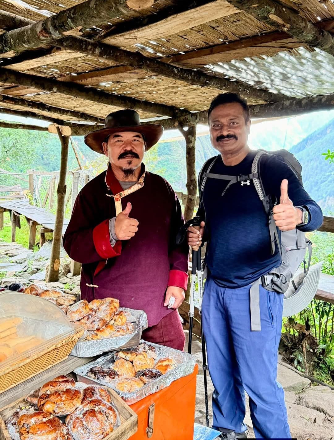 “నా పేరు దందప్ లామా… అంతా నన్ను లామా అన్న పొట్టి పేరుతో పిలుస్తూ ఉంటారు,” అని పరిచయం చేసుకున్నాడు. “ఇవి మా ఇంట్లో మా ఆవిడ చేసినవి,” అంటూ కొన్ని ‘యాపిల్ పై’లు అందించాడు. చాలా రుచిగా ఉన్నాయవి. ఆ మాటే అతనికి చెప్పాం. వాళ్ళావిడ పాకప్రావీణ్యాన్ని మెచ్చుకున్నాం. తన కంచరగాడిదల శ్రేణి మా గమనానికి ఆటంకం కలిగిస్తున్నందుకు ఆయన విచారం వ్యక్తపరిచాడు. ఈ రాత్రి ఎక్కడ ఉండబోతున్నారూ అని వాకబు చేసాడు. నామ్రుడ్ (Namrung) గ్రామంలో ‘నుబ్రి ఫోర్ సీజన్స్ రిసార్ట్’లో అని రేషమ్ సమాధానం. “ఓహ్ – అక్కడా! సరే – సాయంత్రం మీకు మా యాపిల్ బ్రాందీ రుచి చూపిస్తాను,” అని చిరునవ్వుతో చెప్పాడు. ఆ రిసార్ట్ ఈయనదేనట.